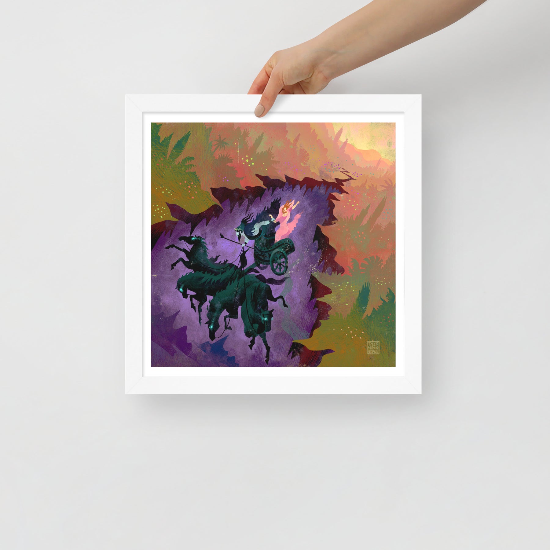 I am Persephone, daughter of Demeter, who gathers flowers in spring when the earth splits beneath my feet. Hades rises in his chariot and carries me to the Underworld as the narcissus wilts in my grasp. My mother searches the world in grief until Zeus sends Hermes to secure my return, but I have tasted the pomegranate and must remain half the year below. When I rise, the world blooms again; when I descend, it withers in mourning.