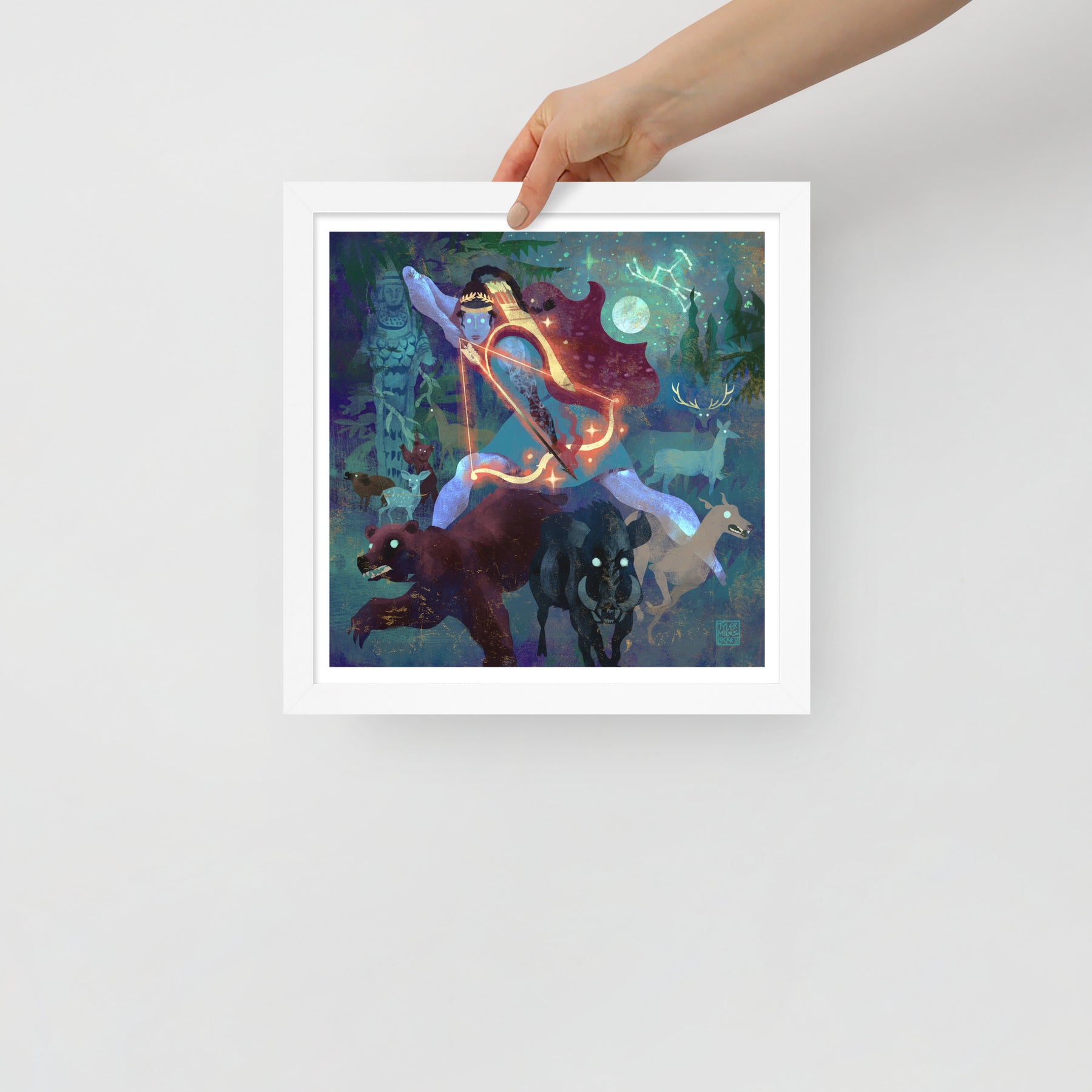 I am Artemis, goddess of the hunt and protector of the wild, standing beside my golden-horned stag and surrounded by my hounds. The Calydonian boar charges through the forest I command, while my bow gleams beneath the silver moon. I punish those who break their vows or trespass upon my sacred groves. I guard both birth and death, guiding life through the balance of nature.