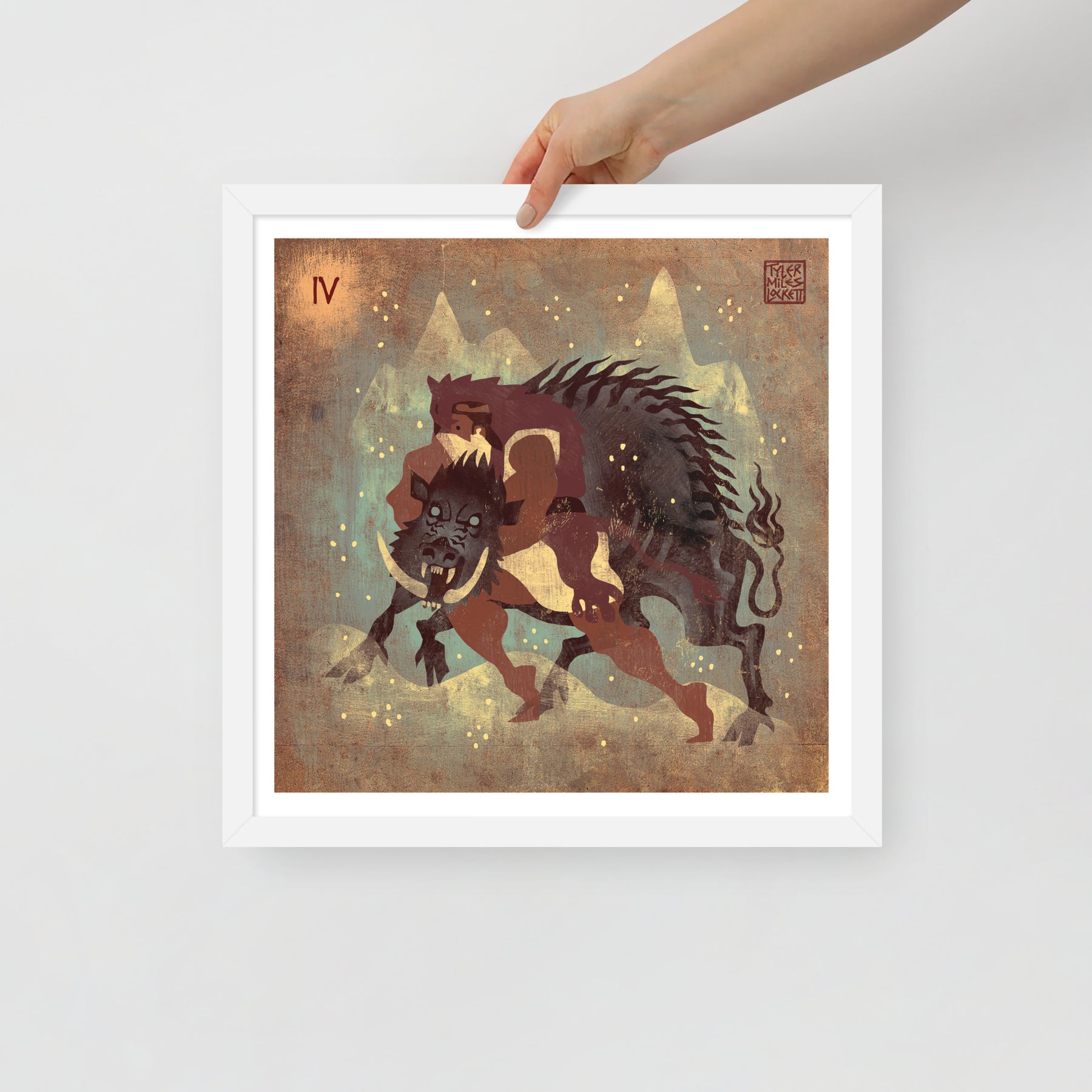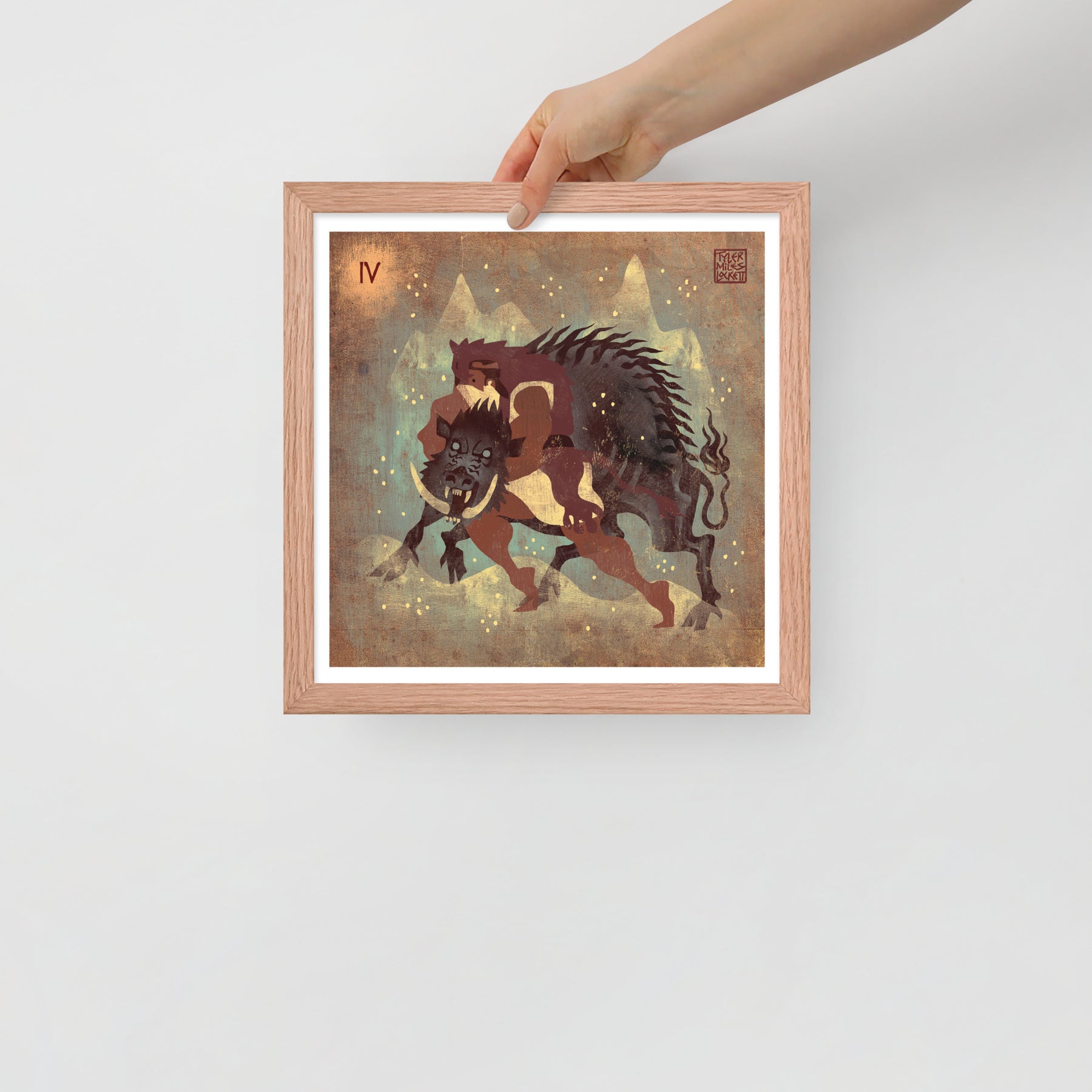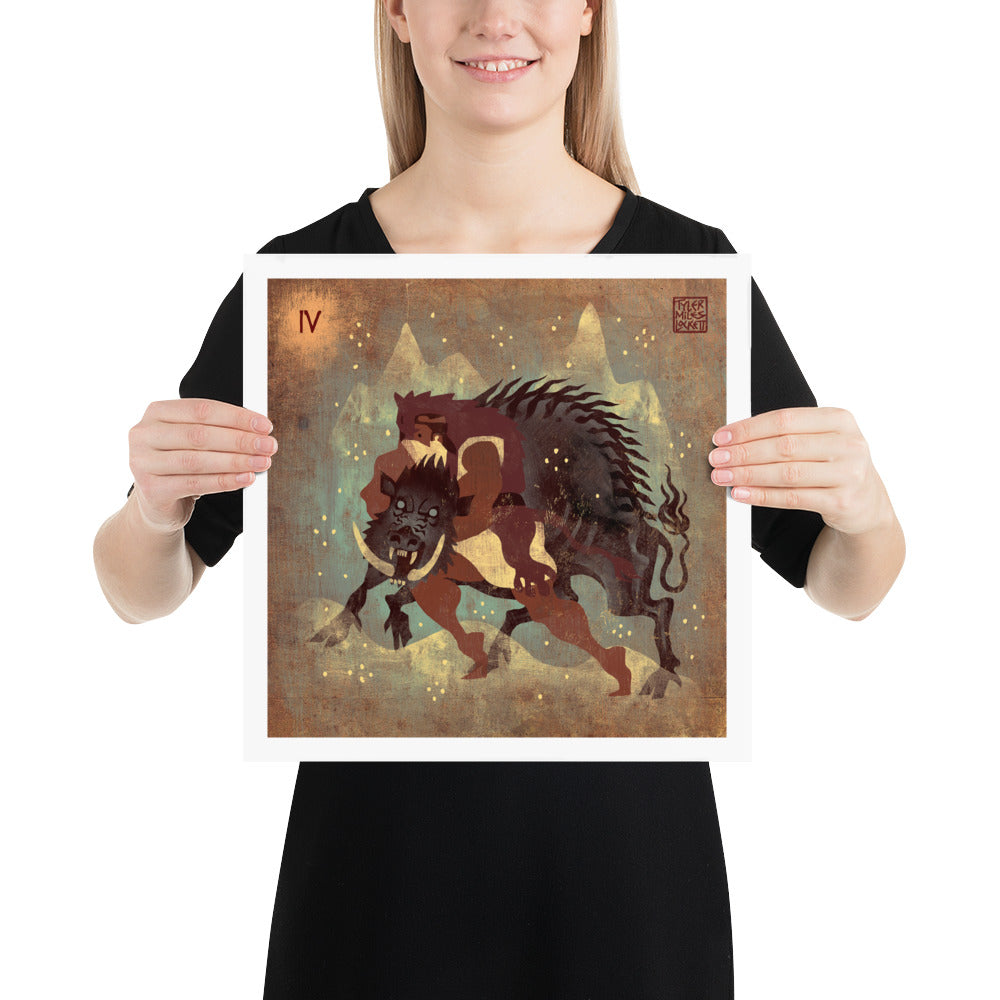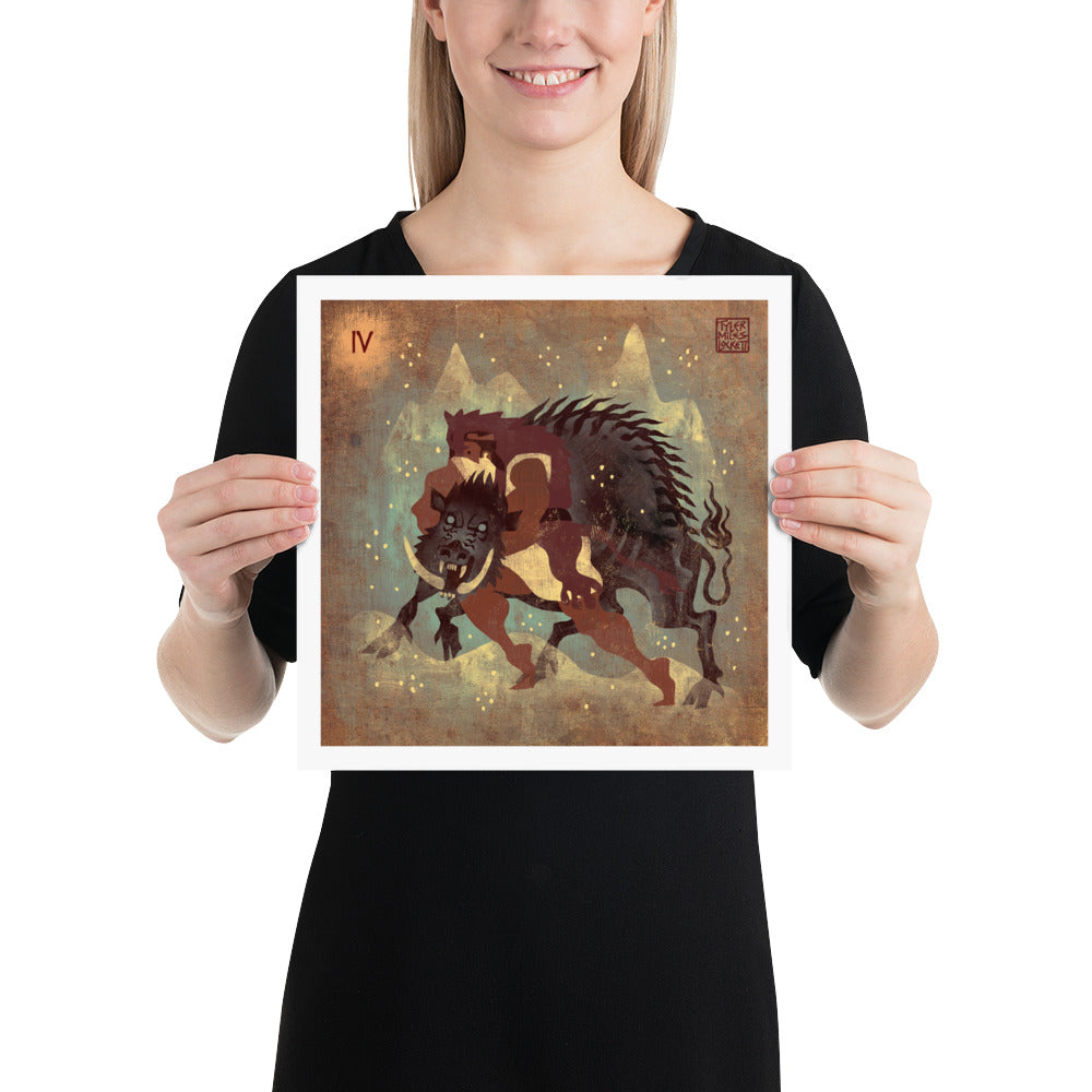 In the snowy peaks of Arcadia, I wrestle the raging Erymanthian Boar until it submits beneath my grip. The beast’s thrashing strength tests both body and restraint. When I return with it slung across my shoulders, Eurystheus cowers in fear once more. For every victory, Hera finds new ways to humble me.