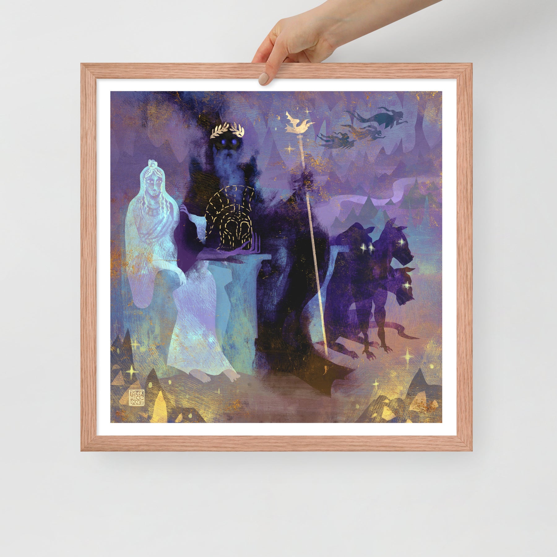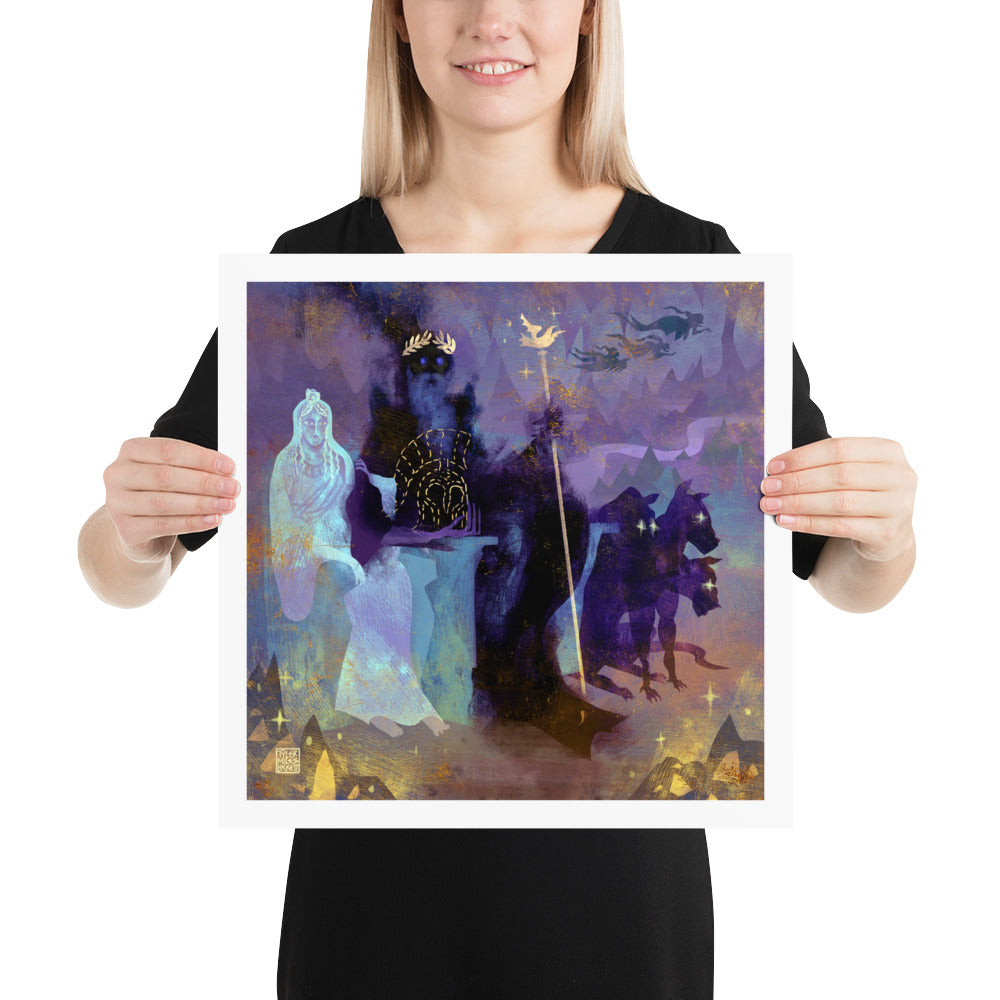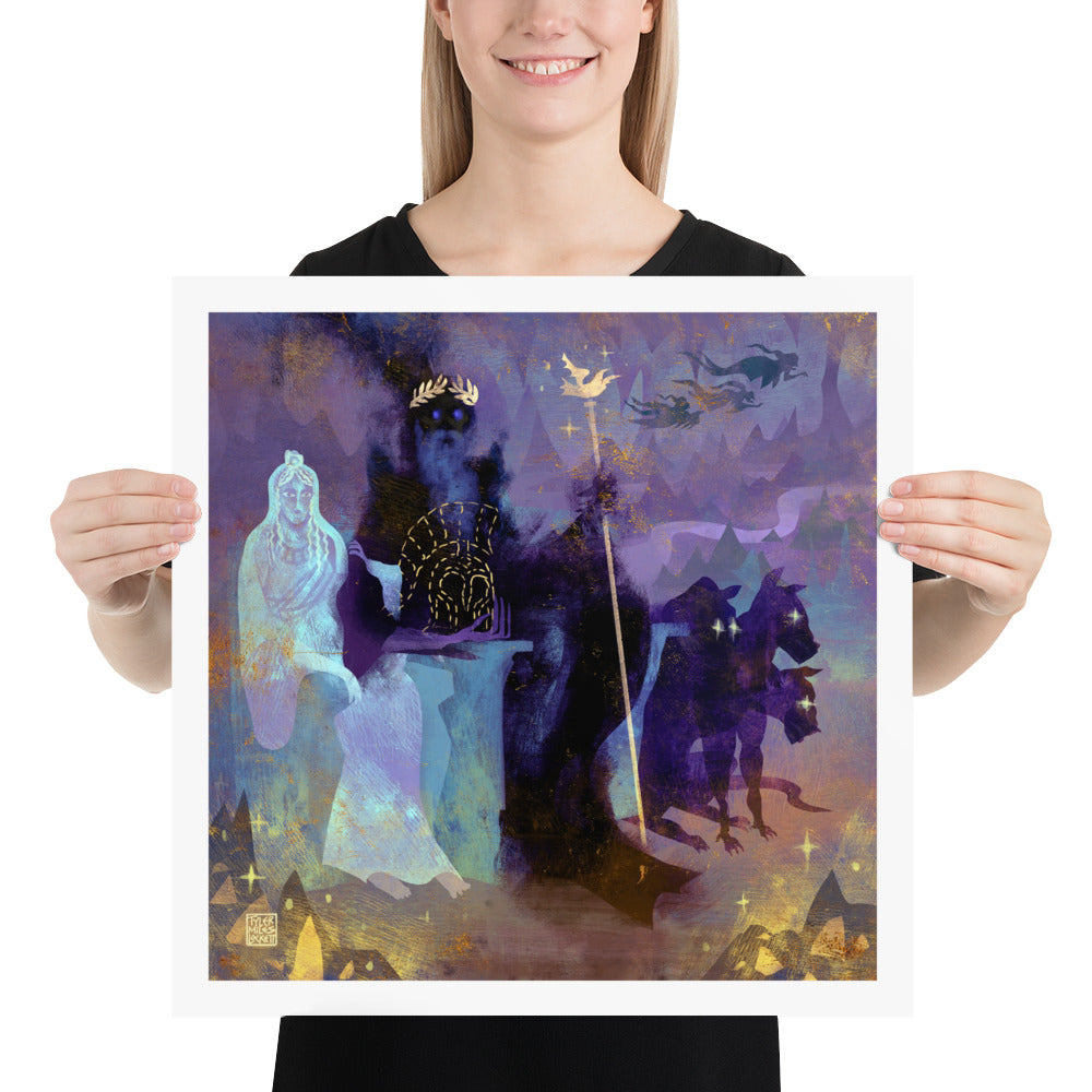 I am Hades, sovereign of the dead, seated upon my throne beside Queen Persephone. In one hand I hold the bird-tipped scepter, symbol of my dominion, while the Helmet of Invisibility rests beside me, forged by the Cyclopes. The Erinyes hover in the dark, punishing those stained by blood and oath-breaking, as Cerberus guards my feet with unyielding loyalty. Though mortals fear my name, I rule with fairness, preserving the balance between life and death.