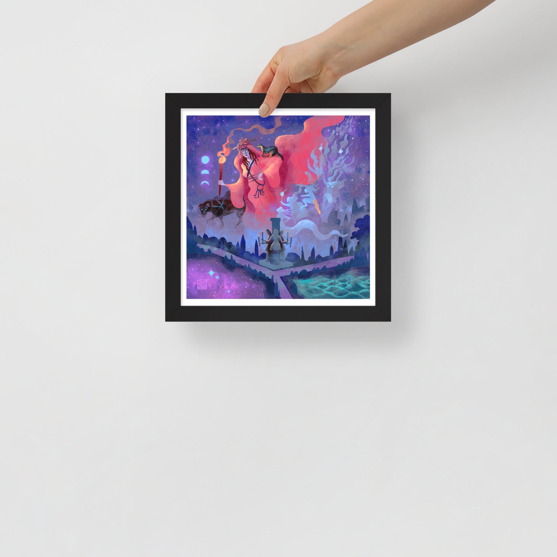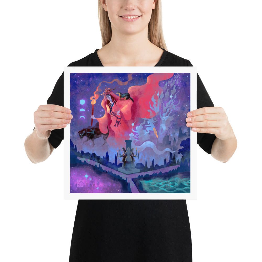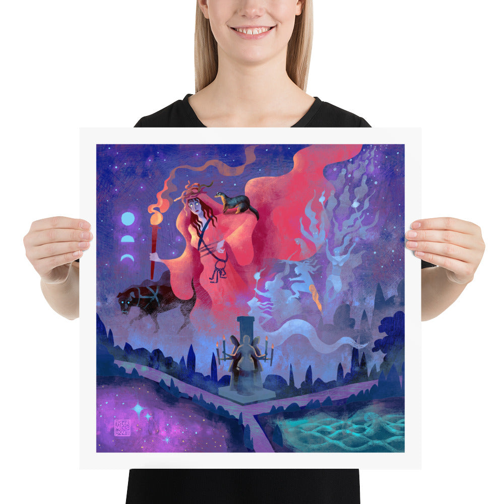 I am Hecate, goddess of magic, crossroads, and moonlight, who moves freely between the realms of the living and the dead. My torches guide Persephone on her path, and my black hound walks at my side, howling beneath the stars. The Lamia, Mormo, and Empousa follow in my train, terrifying mortals who wander by night. At the crossroads, my triple form guards every direction, protecting travelers from unseen spirits.