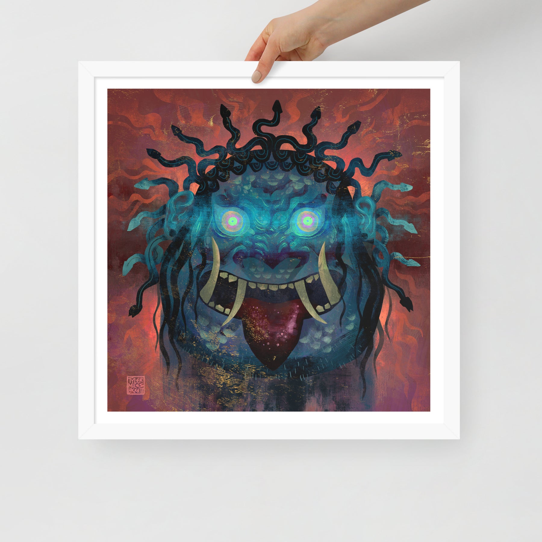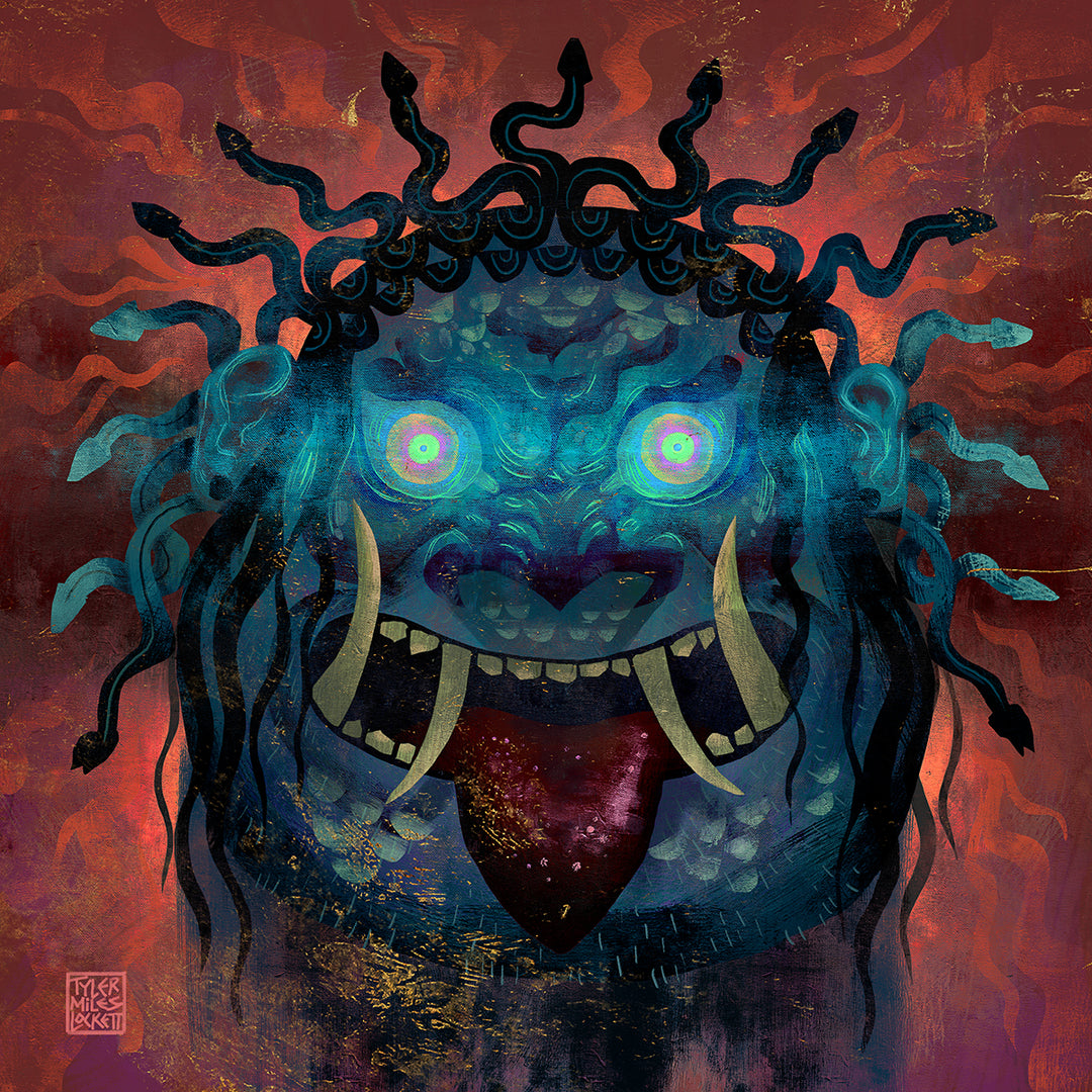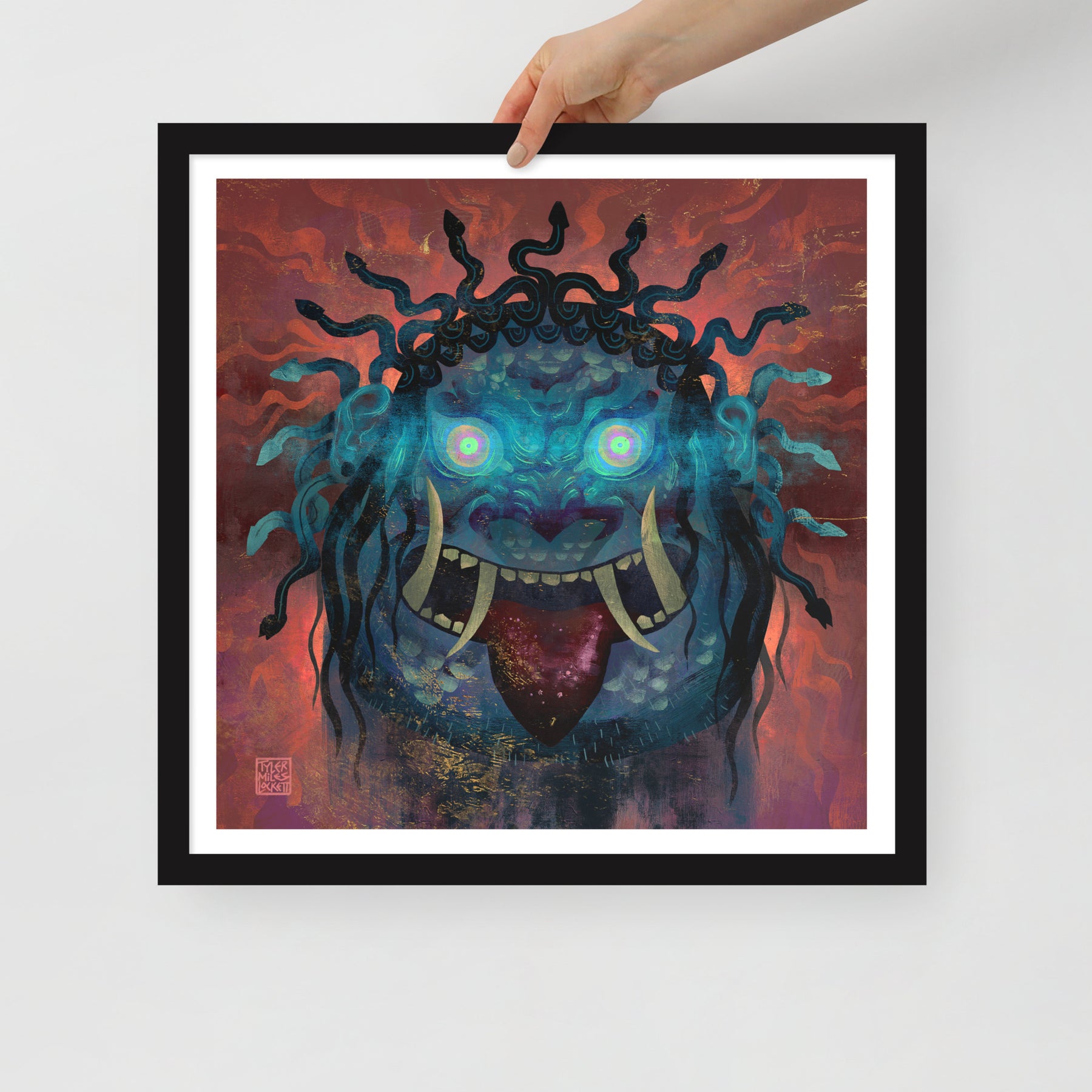 I approach the cavern of the Gorgon sisters, where stone warriors lie frozen in eternal terror. Hidden by Hades’ helm, I move through silence, guided only by Athena’s mirrored shield. Medusa stirs as I raise my blade, her serpents hissing, her eyes burning with divine rage. I strike swiftly before her gaze finds me, ending her reign of fear.