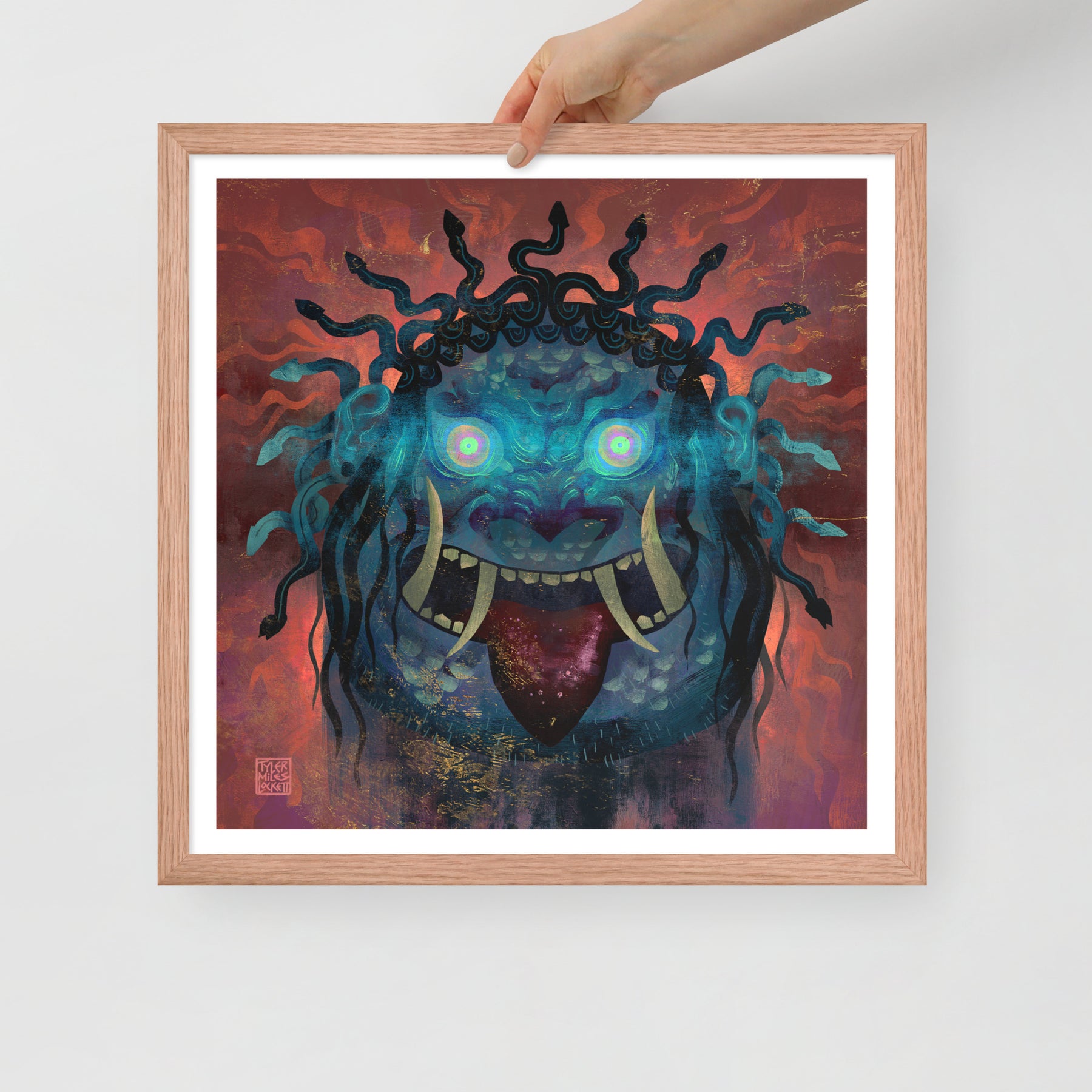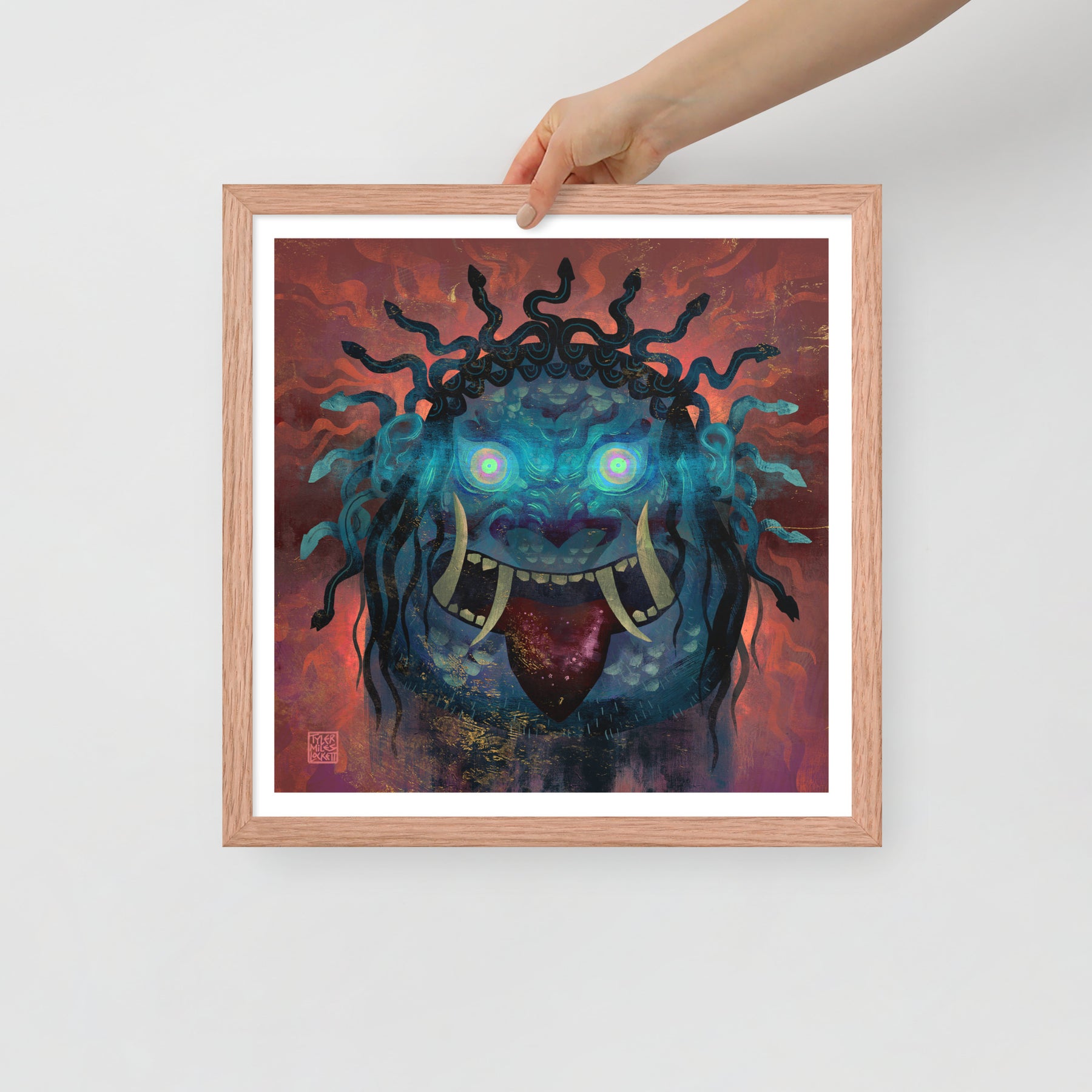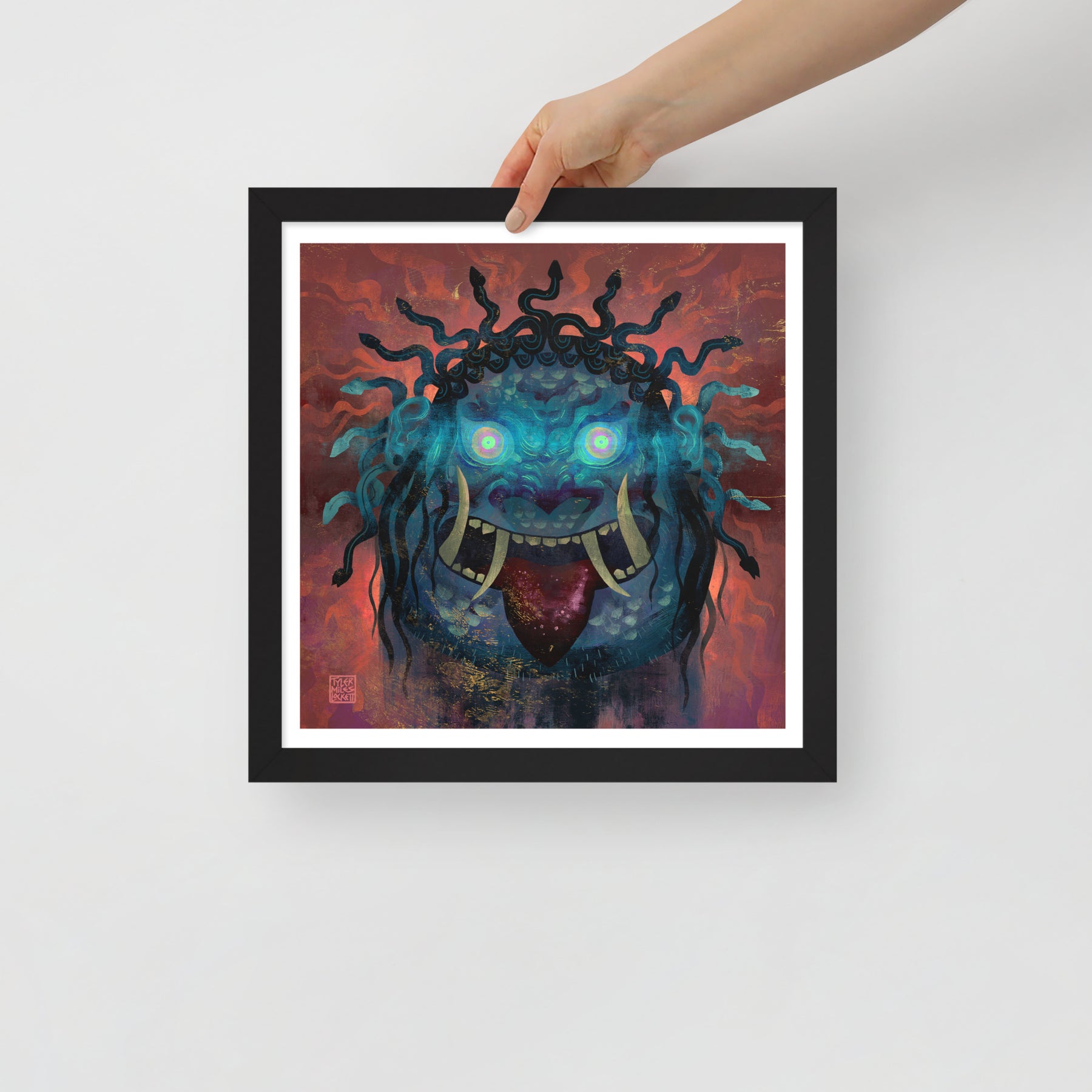 I approach the cavern of the Gorgon sisters, where stone warriors lie frozen in eternal terror. Hidden by Hades’ helm, I move through silence, guided only by Athena’s mirrored shield. Medusa stirs as I raise my blade, her serpents hissing, her eyes burning with divine rage. I strike swiftly before her gaze finds me, ending her reign of fear.
