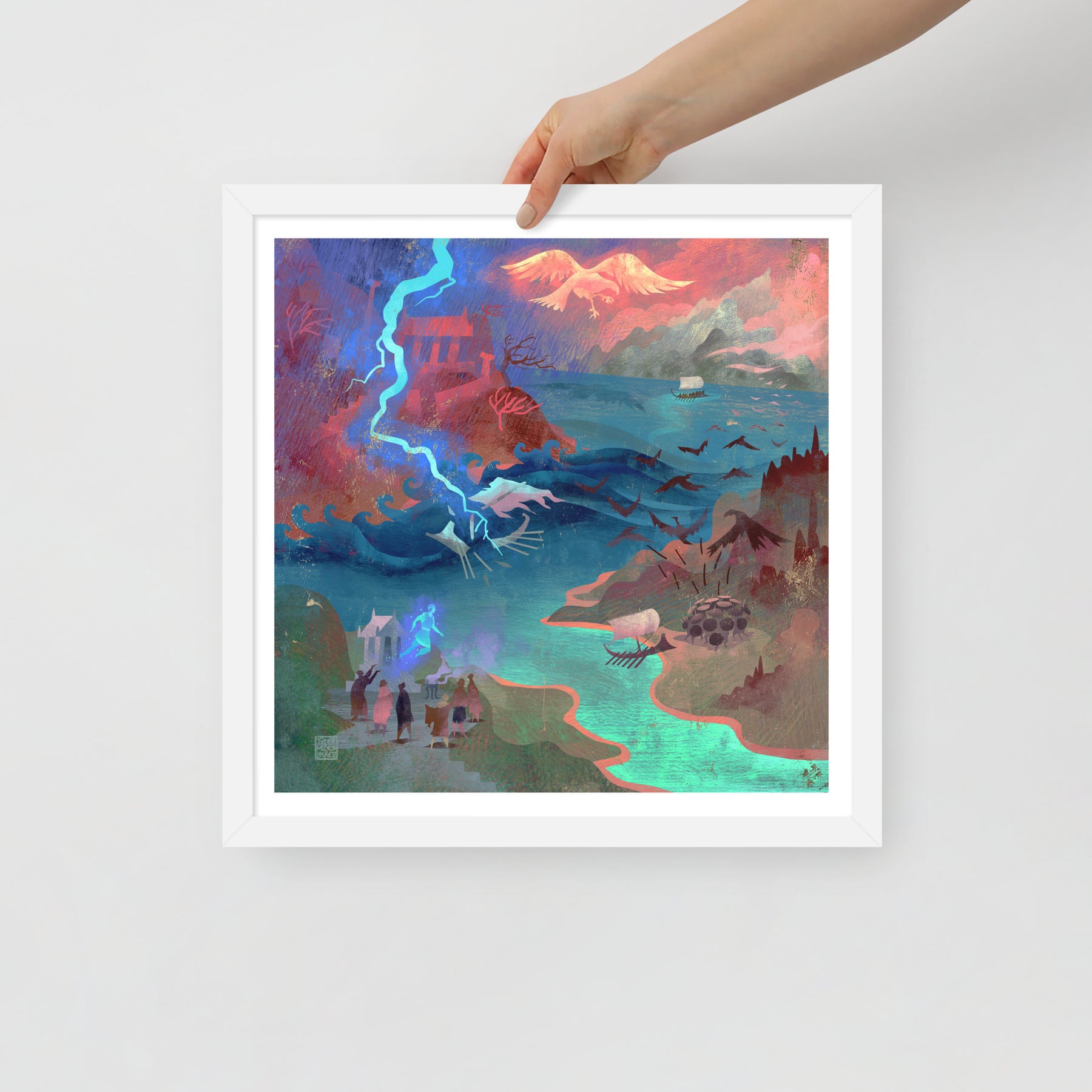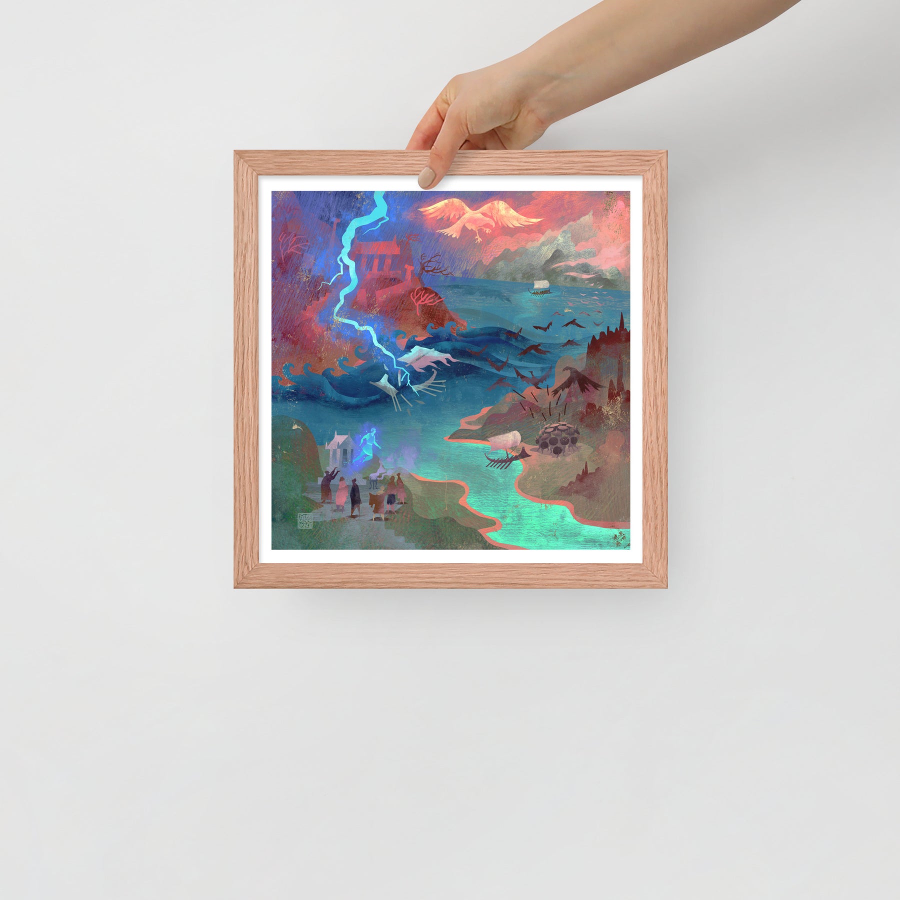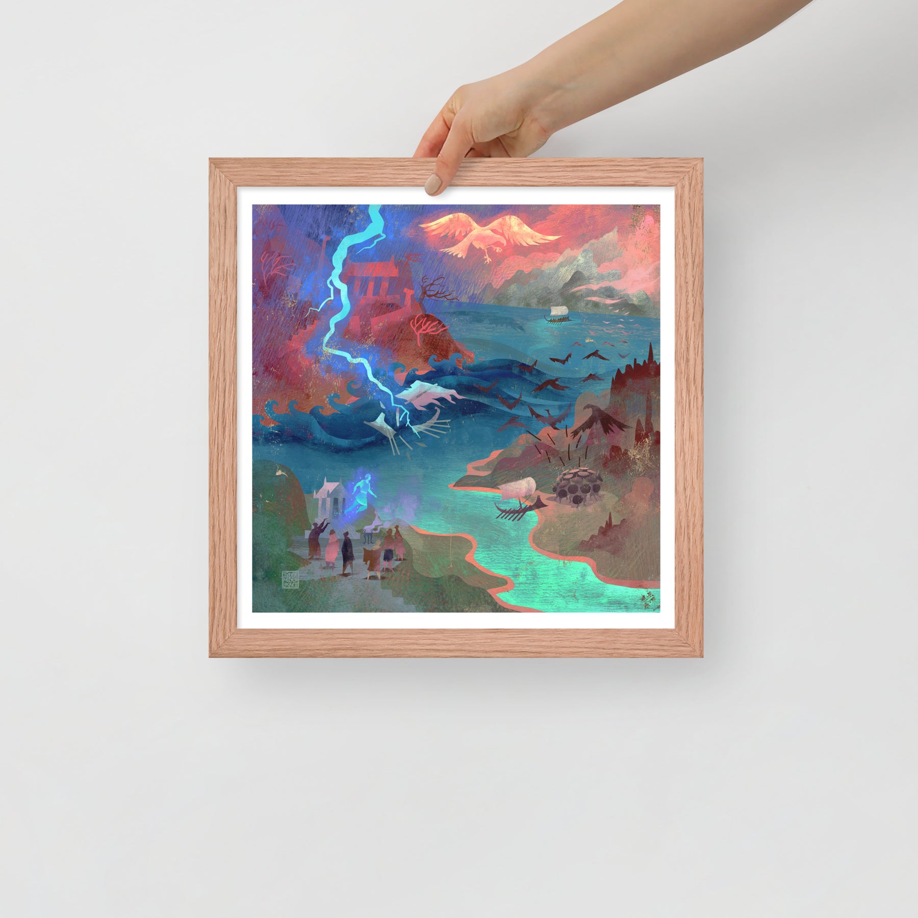 Our oars cut through endless storms until we reach an island guarded by birds that rain metal-tipped feathers from the sky. We raise our shields and shout as one until the war birds scatter into the clouds. Passing the Caucasus, we glimpse Prometheus chained to the mountain, his agony echoing across the sea. At last, we reach Colchis, where the Fleece glows in the shadow of King Aietes’ wrath.