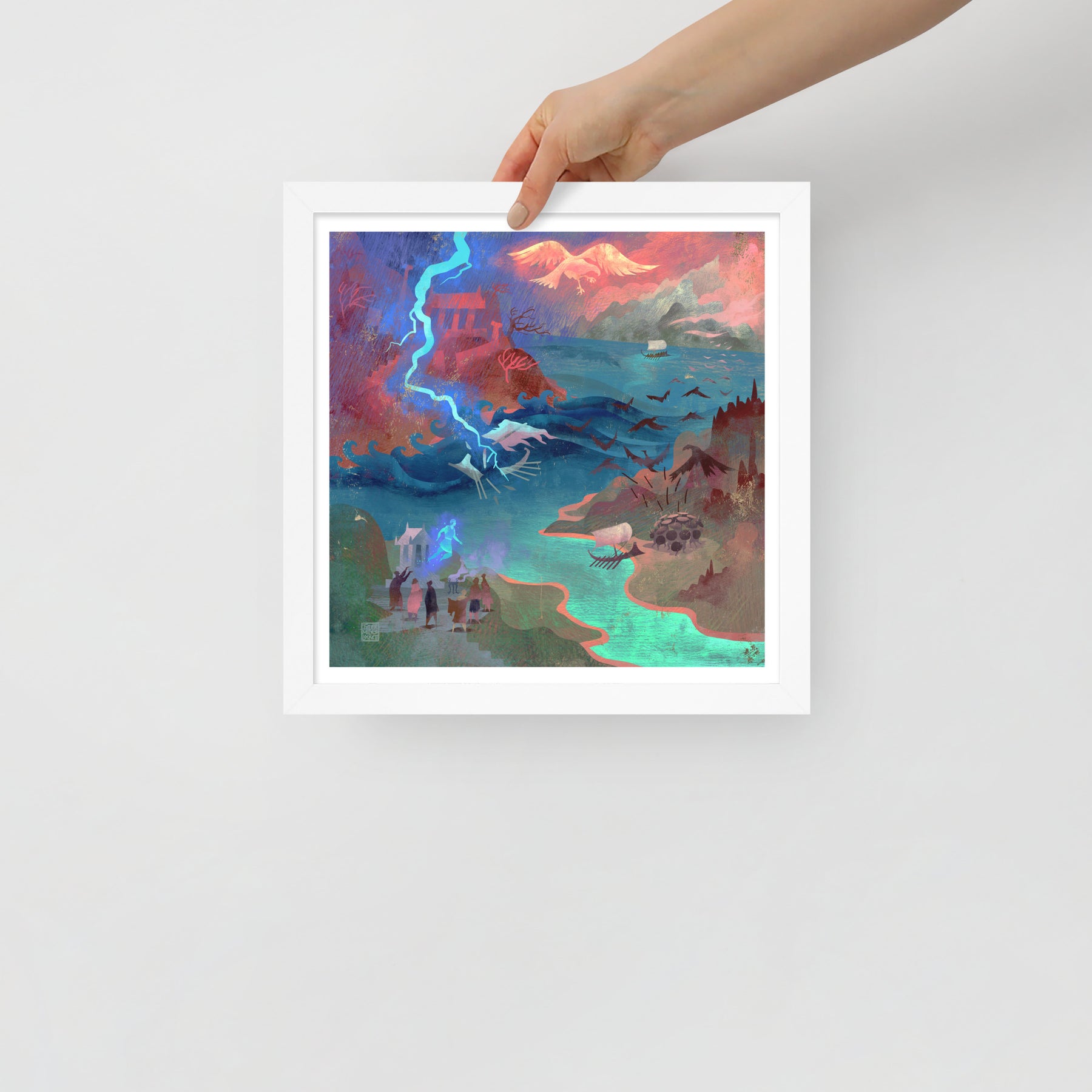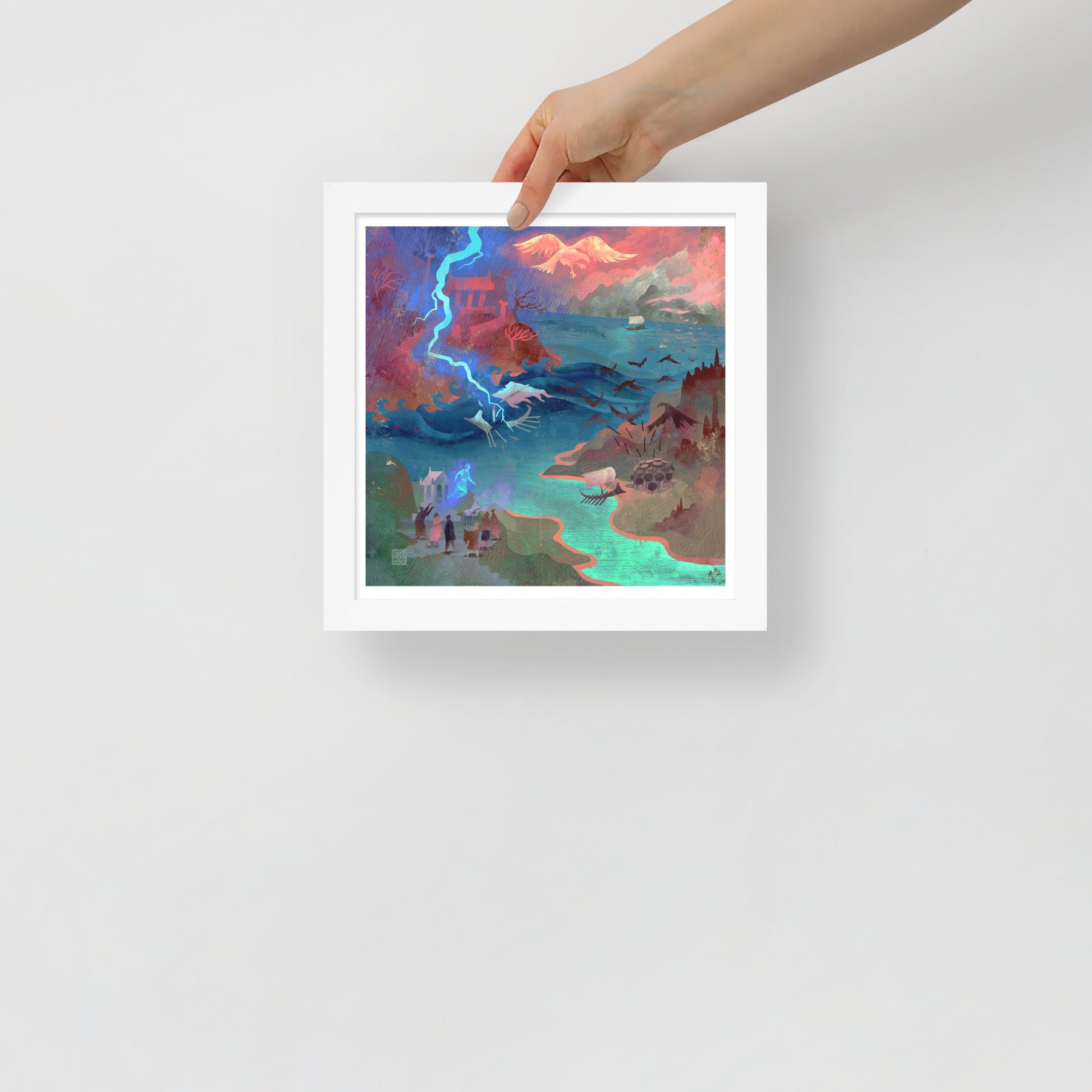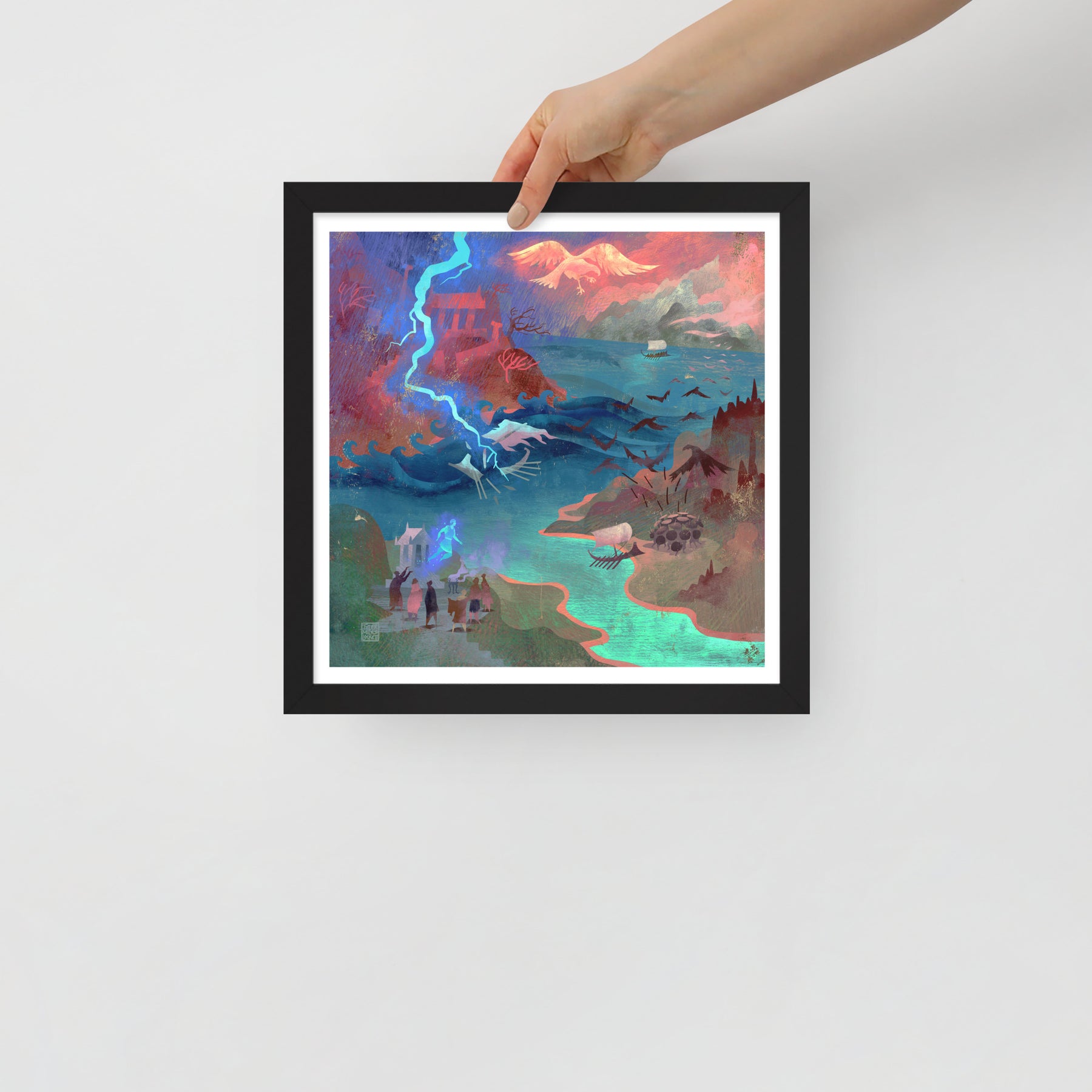Our oars cut through endless storms until we reach an island guarded by birds that rain metal-tipped feathers from the sky. We raise our shields and shout as one until the war birds scatter into the clouds. Passing the Caucasus, we glimpse Prometheus chained to the mountain, his agony echoing across the sea. At last, we reach Colchis, where the Fleece glows in the shadow of King Aietes’ wrath.