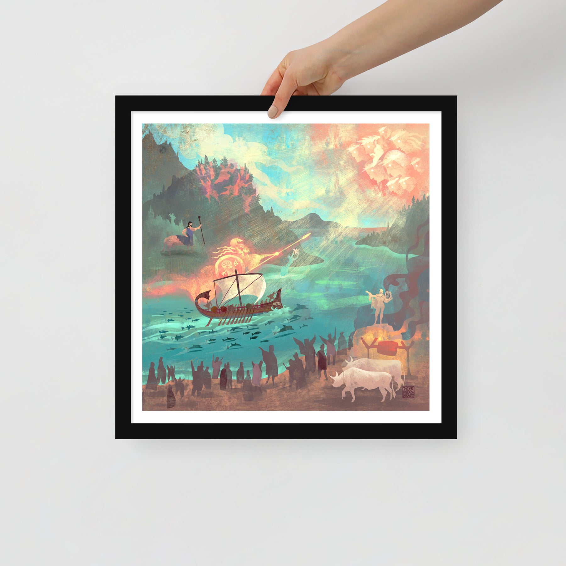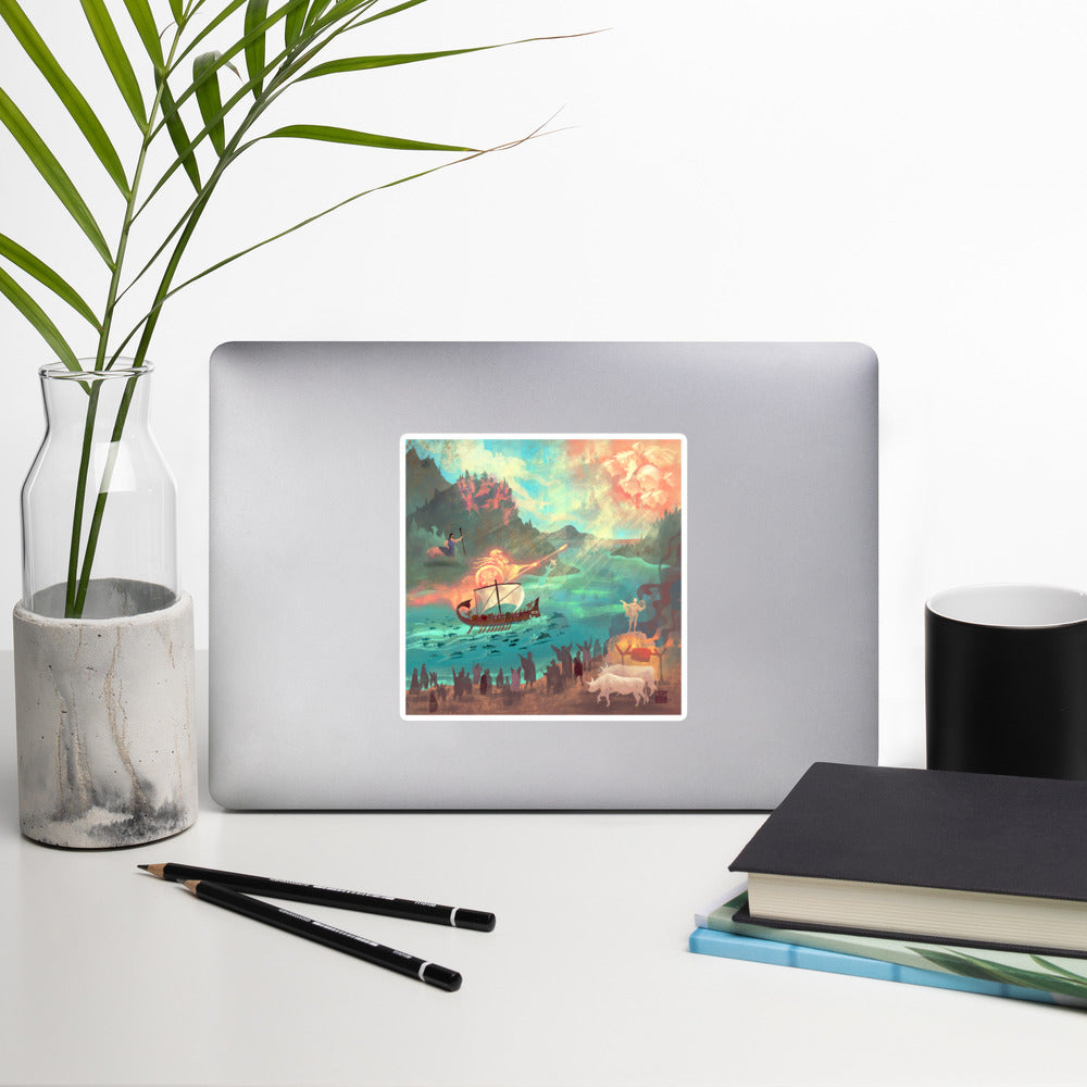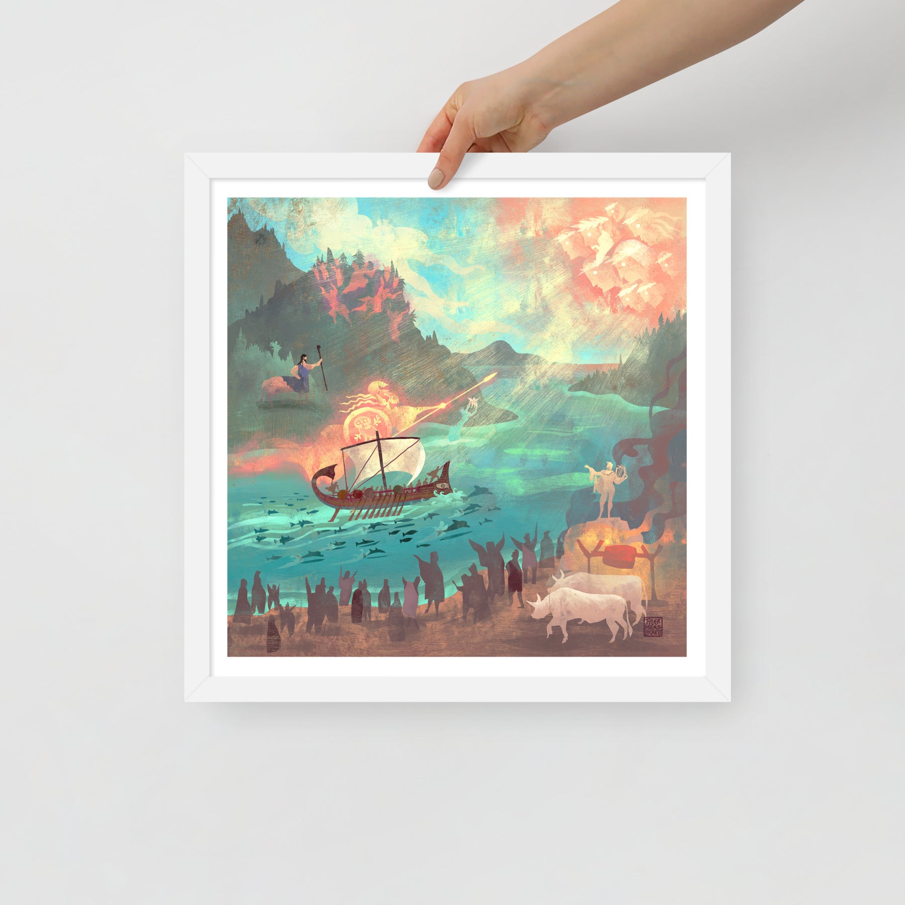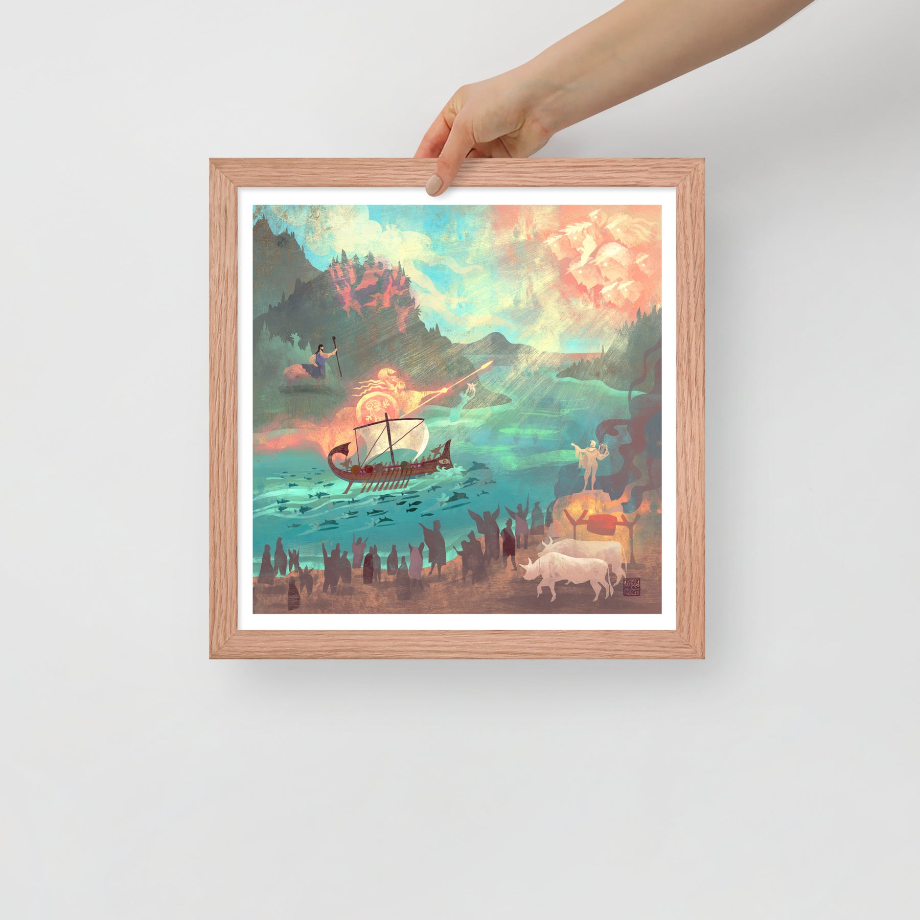 I confront my uncle Pelias, who demands the impossible: bring him the Golden Fleece or forfeit my birthright. Guided by Hera, I accept, and the gods bless our voyage with signs and omens. At sunrise we sacrifice bulls to Apollo, feasting in his honor before setting sail. The world falls away behind us as we leave Iolcos for lands no map dares to name.