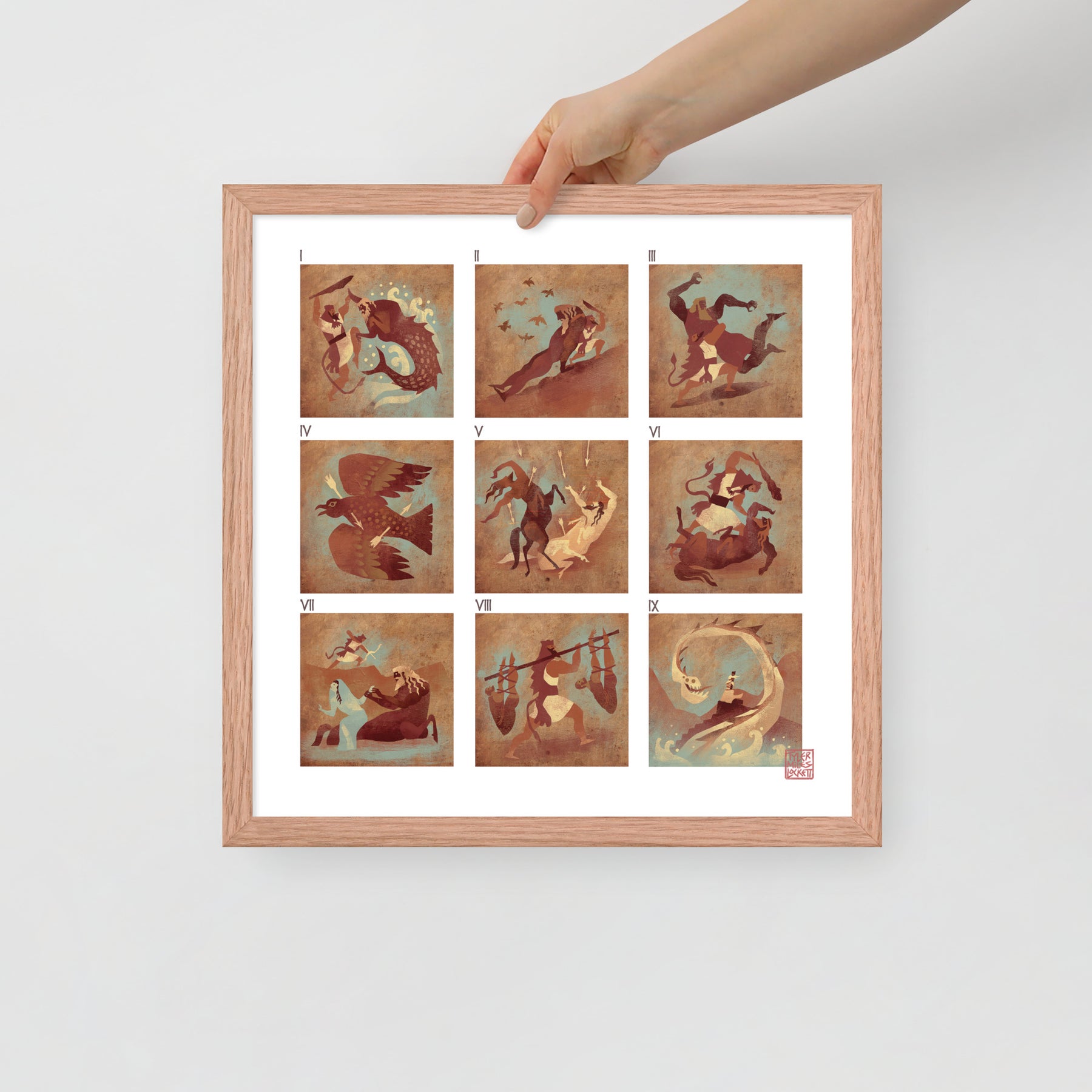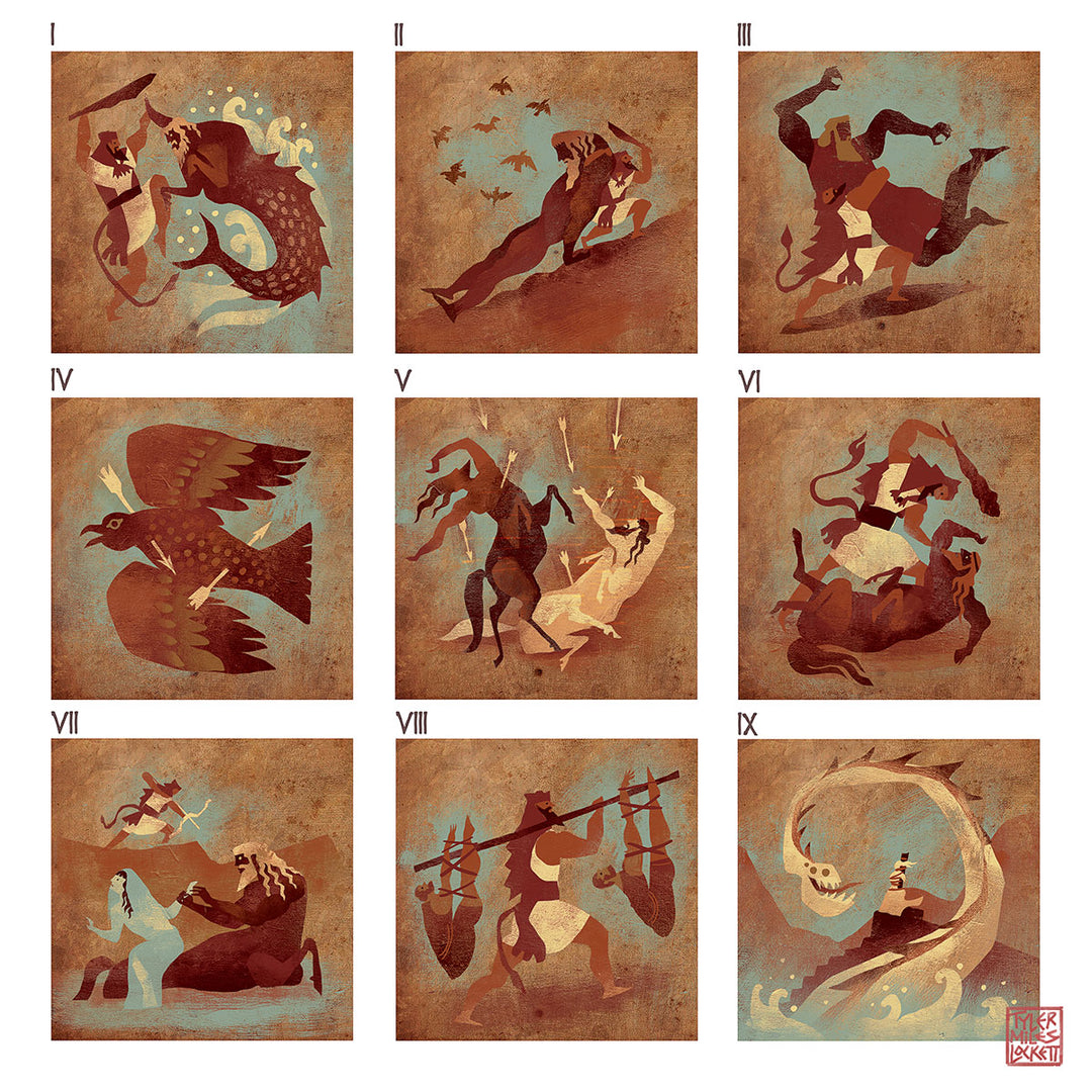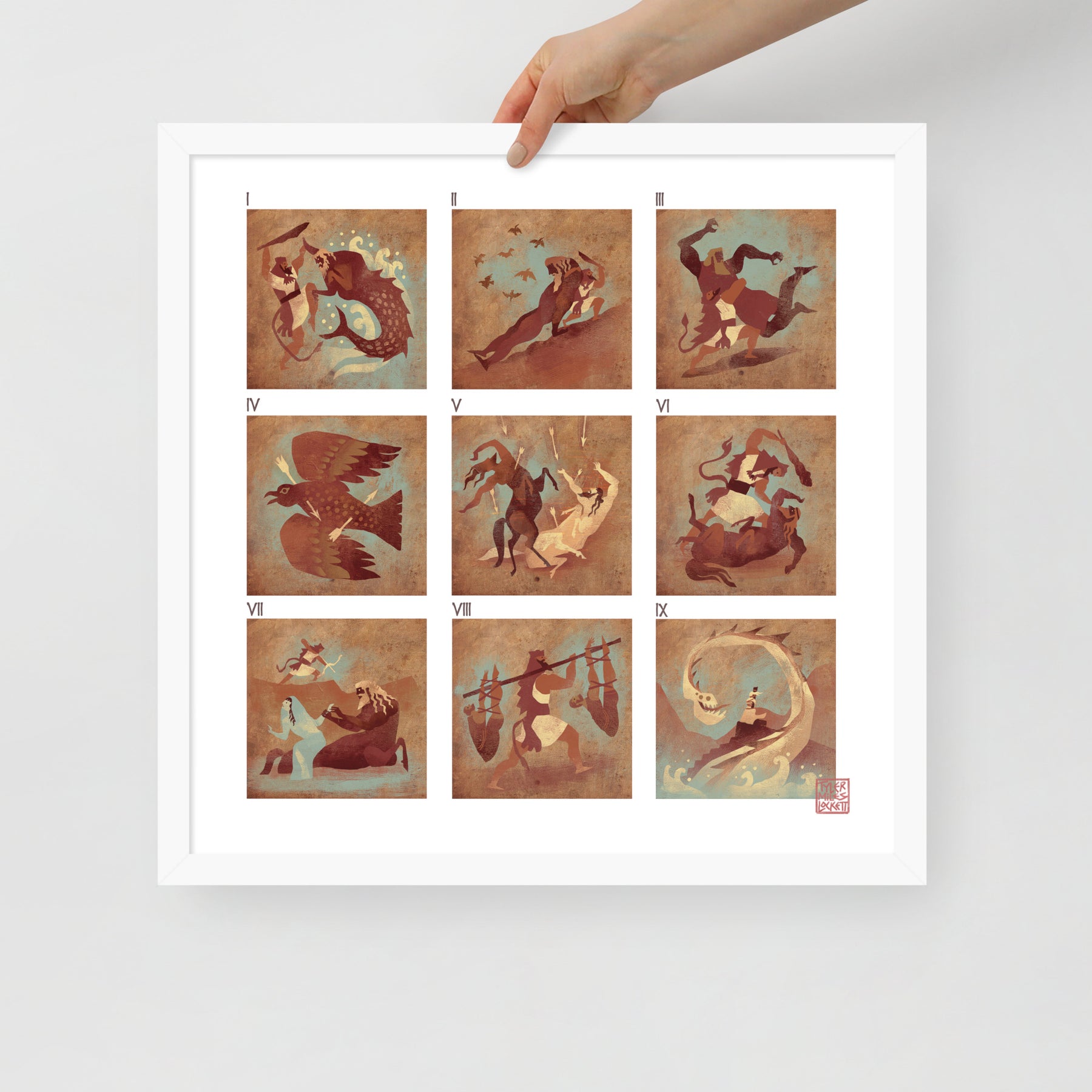 From river gods to thieves, monsters to immortals, my parerga never cease. I crush Antaeus, capture the trickster Cercopes, and slay the sea-beast sent by Poseidon. No trial, however strange, can exhaust the will of one who seeks redemption. In every feat, I find both glory and grief.