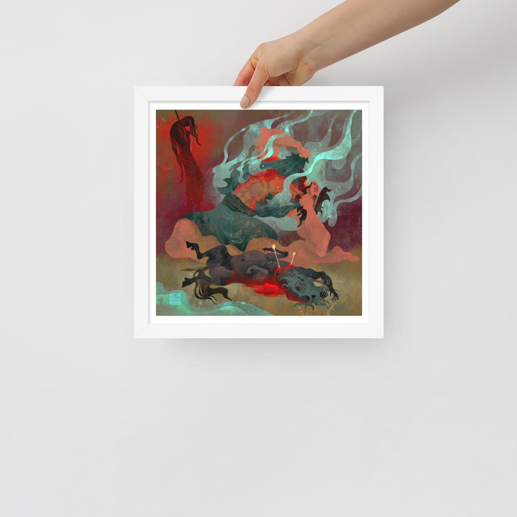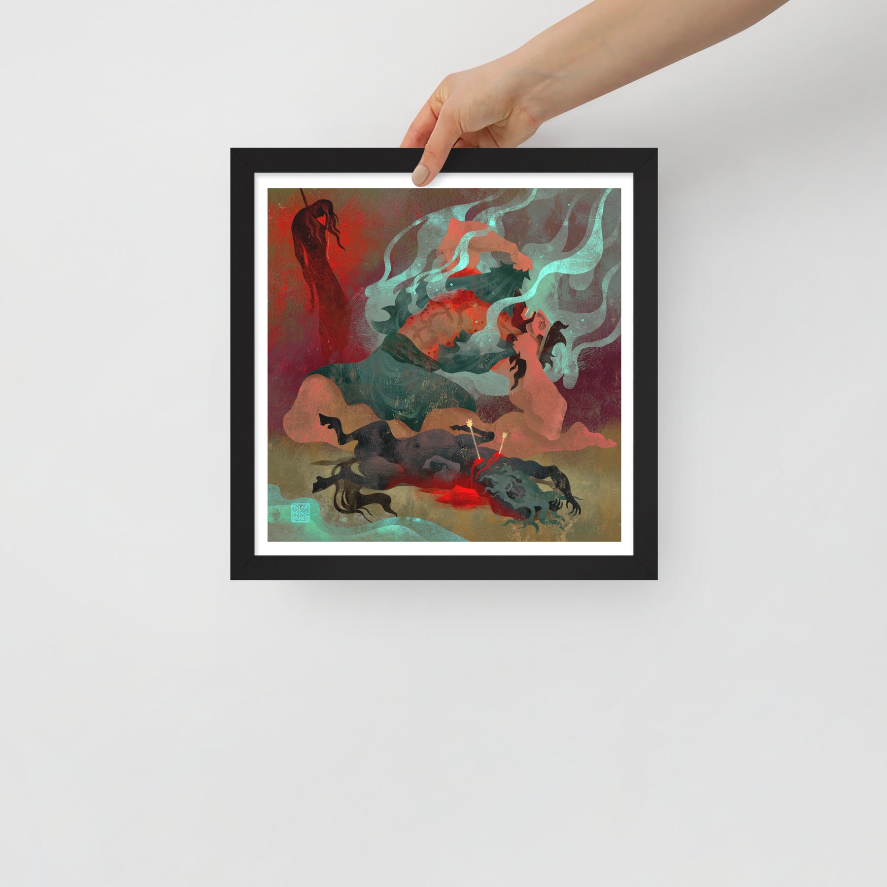 Years later, my wife Deianira, deceived by the dying centaur Nessus, sends me a tunic steeped in poison. The fabric burns my flesh, searing through muscle and bone. Realizing her mistake, she ends her own life in grief. I endure the flames, seeking death as my final release.