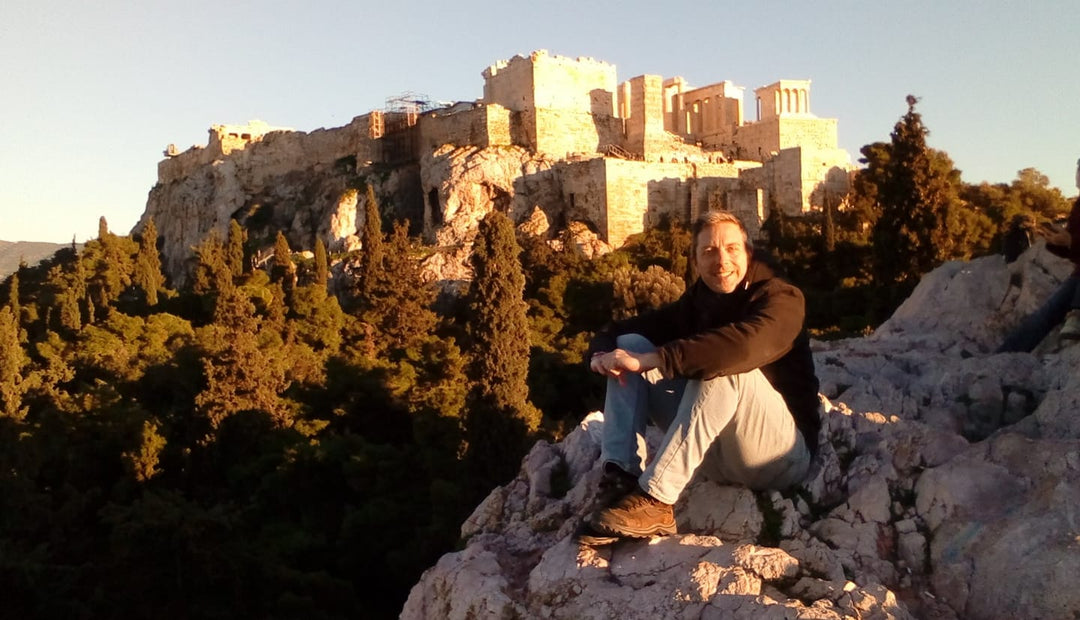 Here I am in ancient ruin heaven, soaking up the warmth of golden hour light, as the Athenian acropolis glows majestically in the background. Hell of a view!