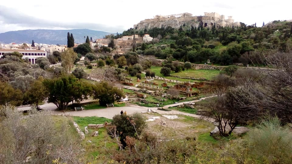 Here is a view of the ancient Agora, once the heart of Athenian life where citizens gathered for commerce, politics, and philosophical exchange. Figures like Socrates often engaged the public here. Rising in the background is the Acropolis, crowned by the Parthenon, the great Temple of Athena where major religious ceremonies were held