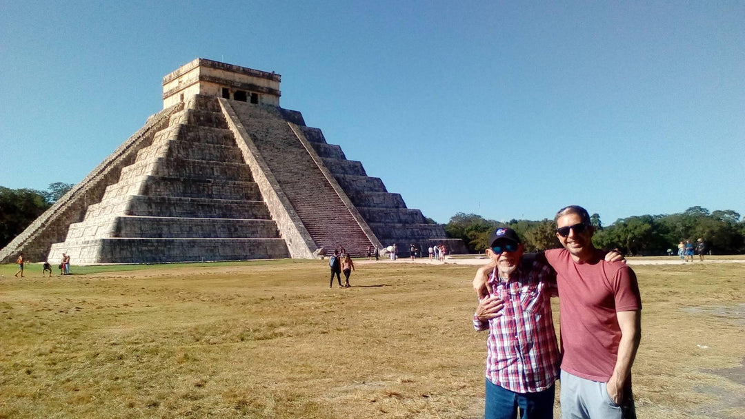 My dad and I standing before the central pyramid of the Mayan city of Chichen Itza.